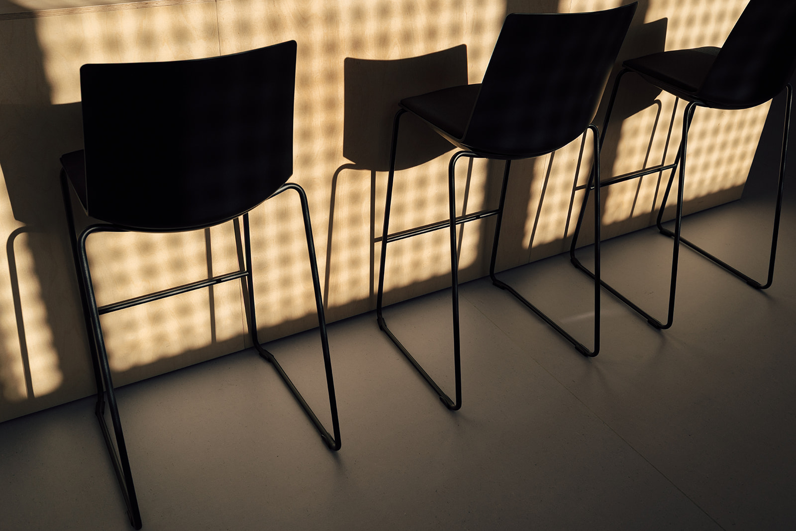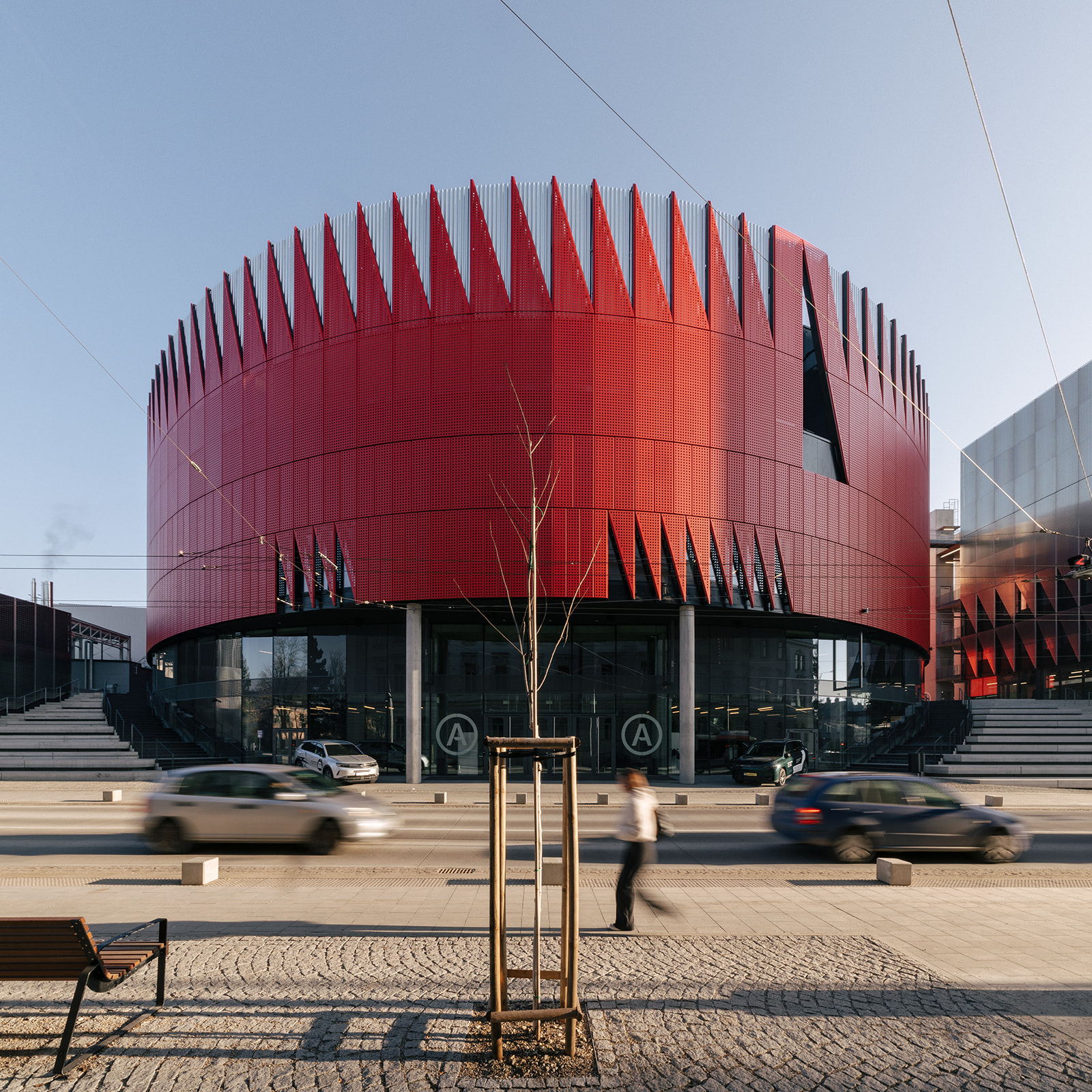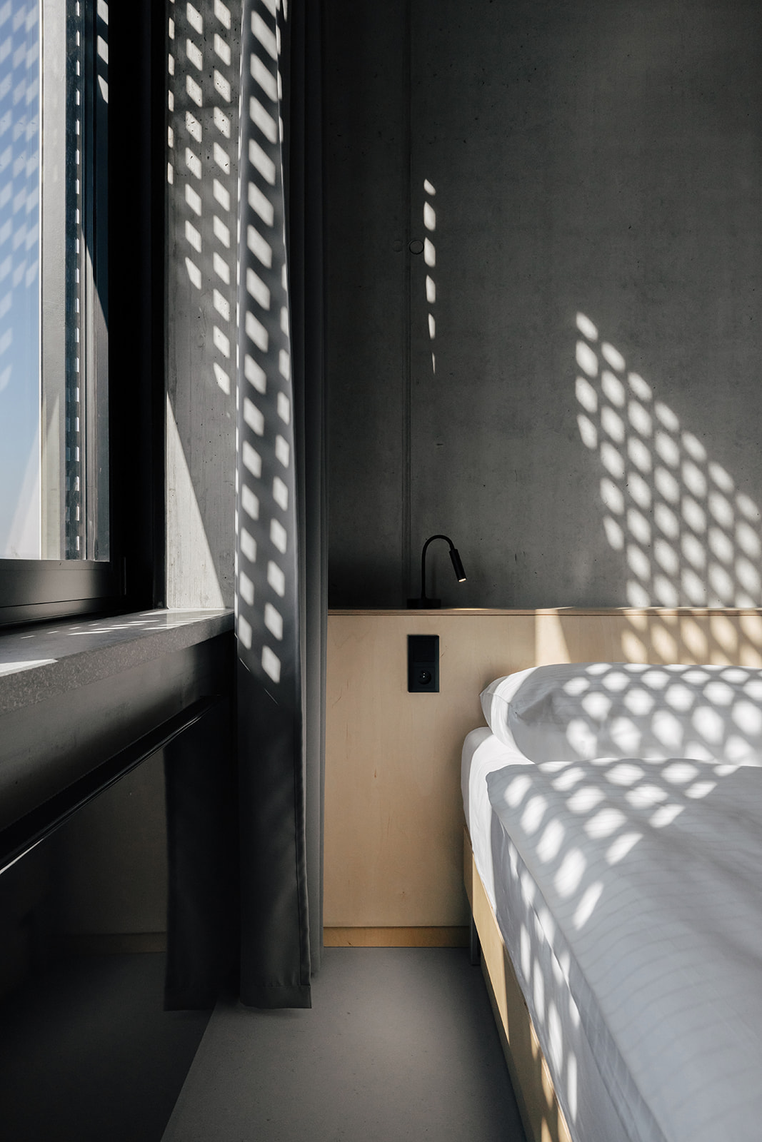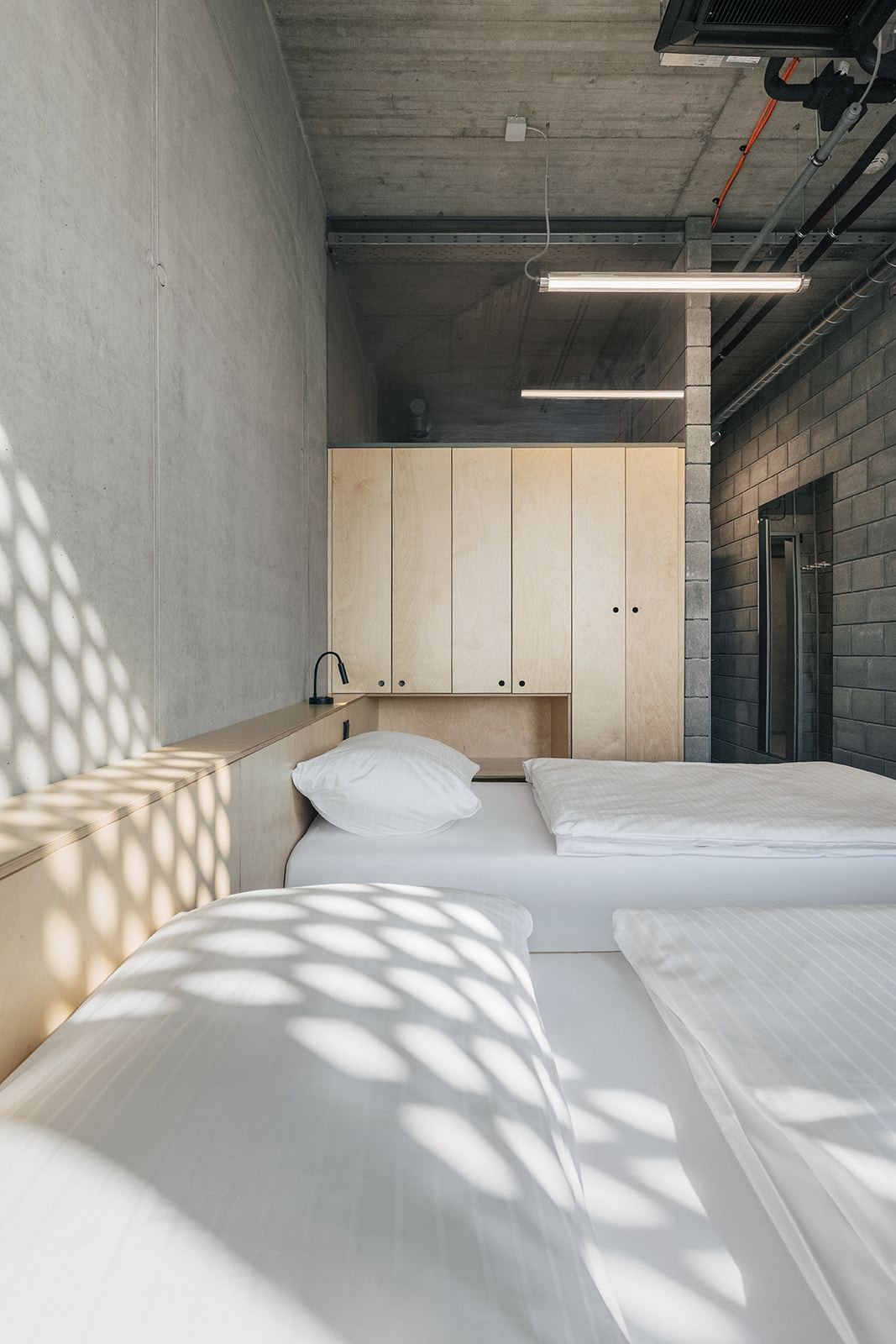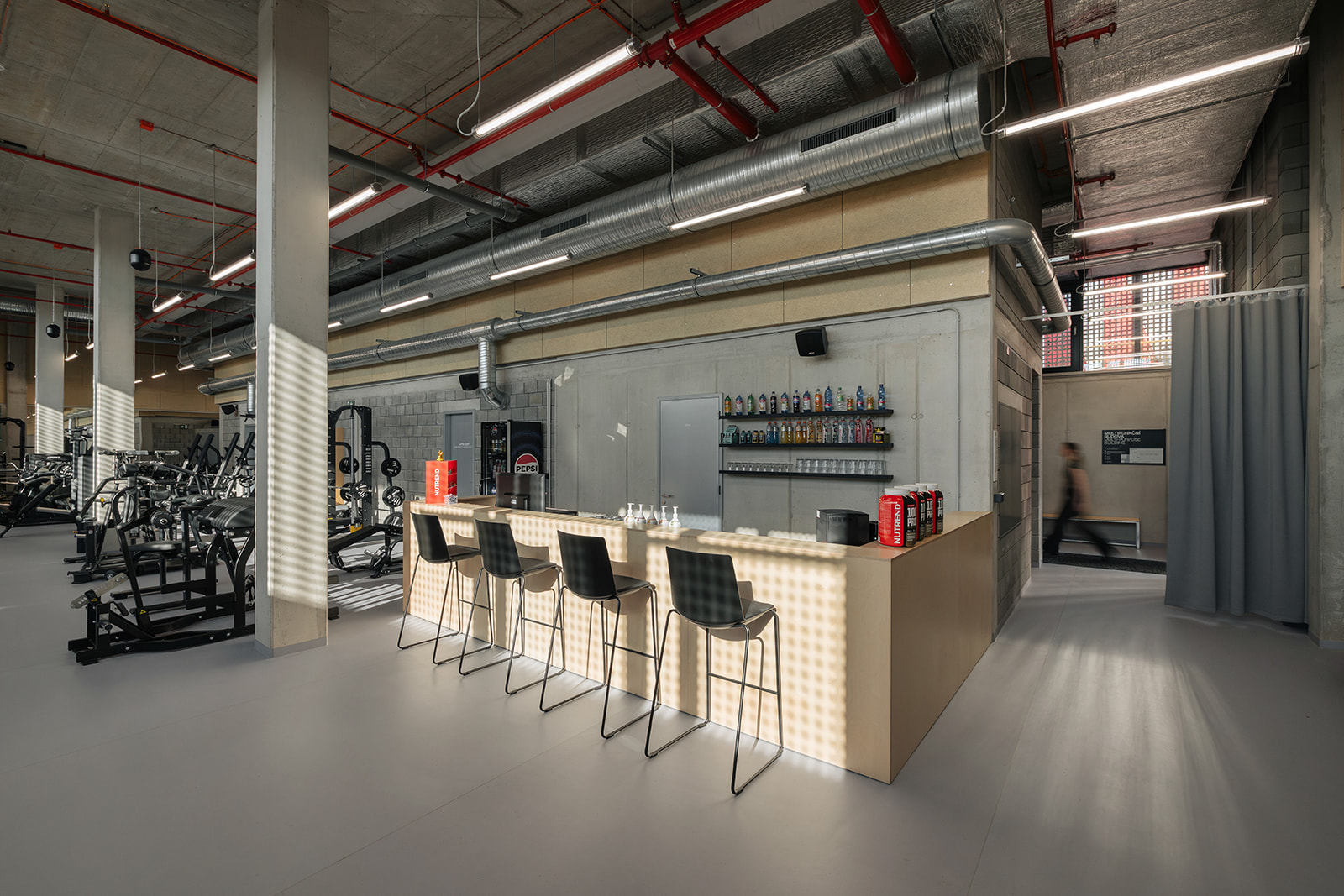 Napříč celým objektem se opakuje kombinace dvou hlavních materiálů, které určují charakter interiéru. Překližka přináší teplo, přirozenou strukturu a sjednocující prvek. Žárově pozinkovaná ocel naopak zajišťuje odolnost a odpovídá nárokům sportovního prostředí. Důležitou roli hraje také práce se světlem. To v interiéru vytváří jemné struktury a proměňuje vnímání materiálů v průběhu dne.
