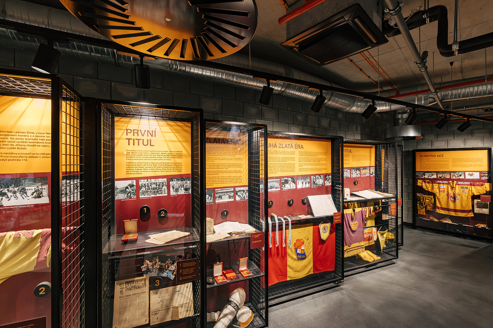 Recepce sportovní části pracuje s přirozeným světlem, které se promítá do povrchu překližkového pultu a vytváří proměnlivou kresbu během dne. Dětský koutek je atypicky řešený prostor pod schodištěm. Překližka je zde doplněna měkčími tvary a zaoblenými hranami. V síni slávy jsme realizovali konstrukce pro výstavní boxy z naší kovovýroby a další atypické prvky. Součástí projektu byly i koordinované dodávky, například osvětlení ve tvaru loga Dukly Jihlava.