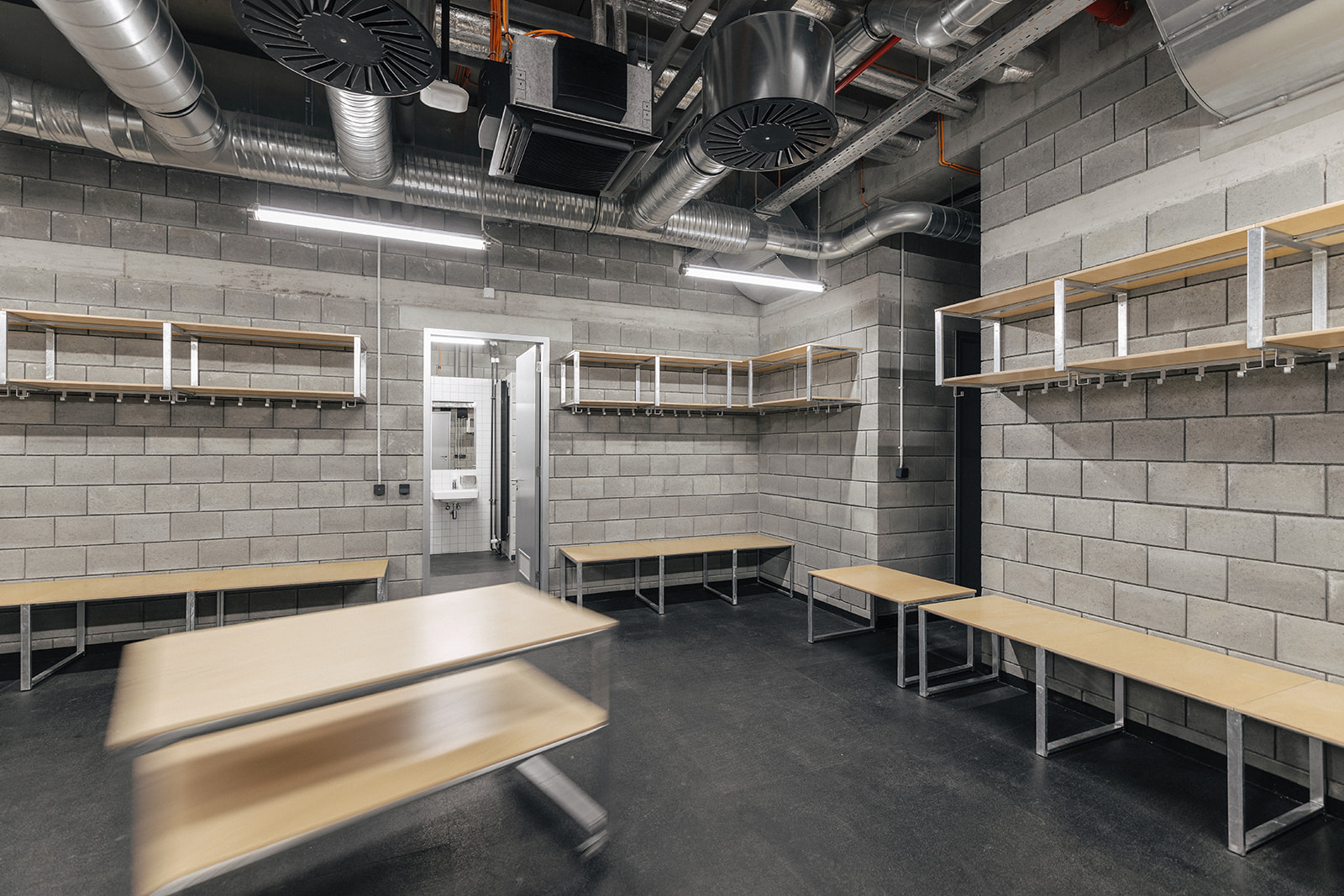 Šatny pro A tým, mládež i hostující kluby jsou navrženy s důrazem na odolnost a každodenní provoz. Konstrukce ze žárově pozinkované oceli je doplněna překližkou a praktickými detaily. Součástí vybavení jsou také mobilní prvky, například pojízdné vozíky, které vycházejí z reálných potřeb uživatelů.