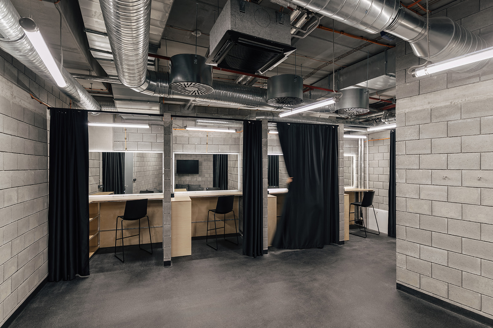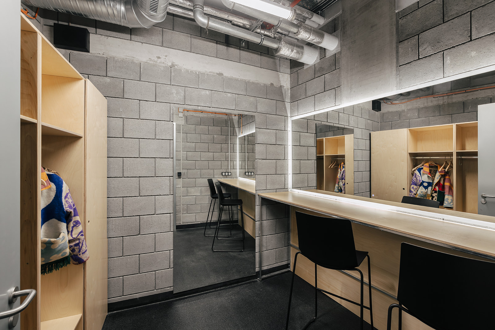 Zázemí pro umělce pracuje s klidnější atmosférou a důrazem na soukromí. Překližkové sestavy doplňují zrcadla s odpovídajícím osvětlením a pracovní plochy. Materiálově navazuje na zbytek interiéru, ale výraz je střídmější a uzavřenější.